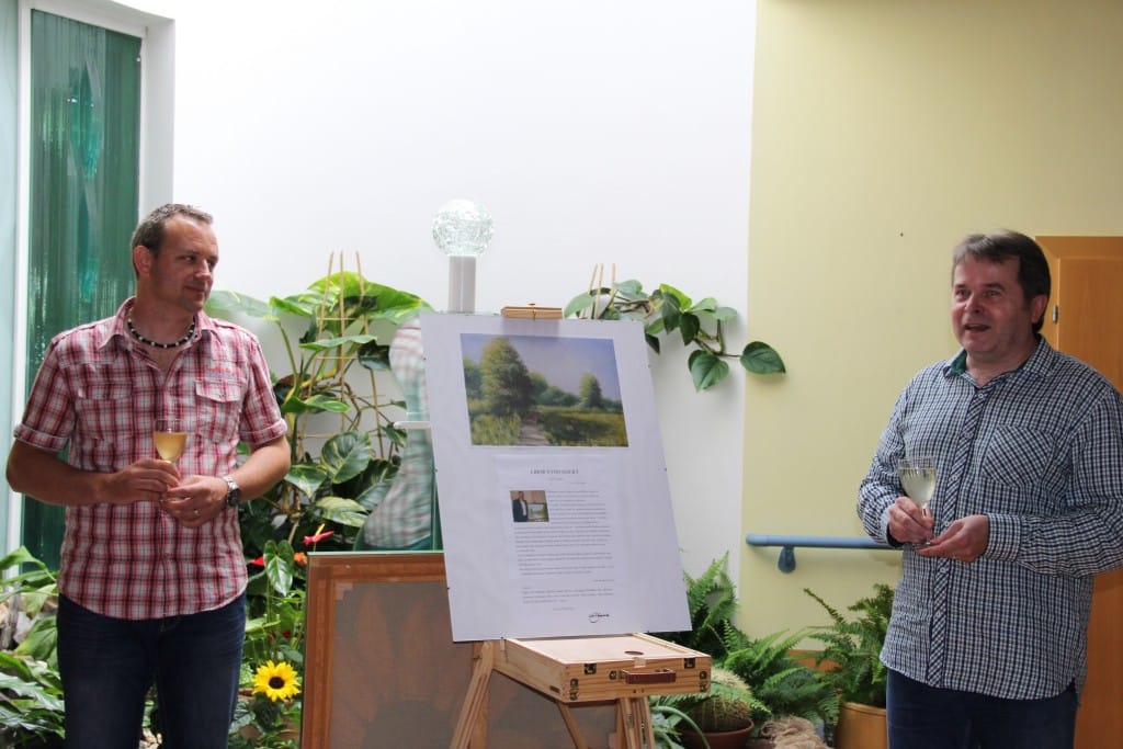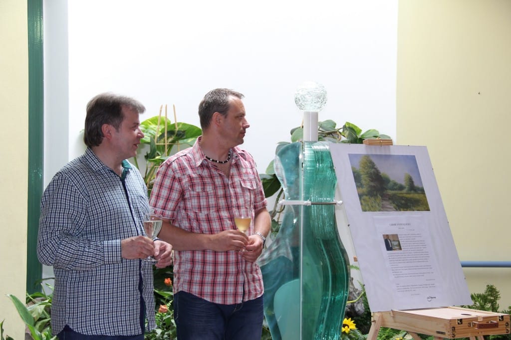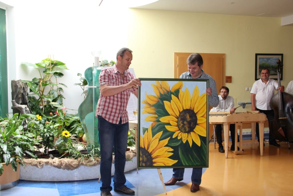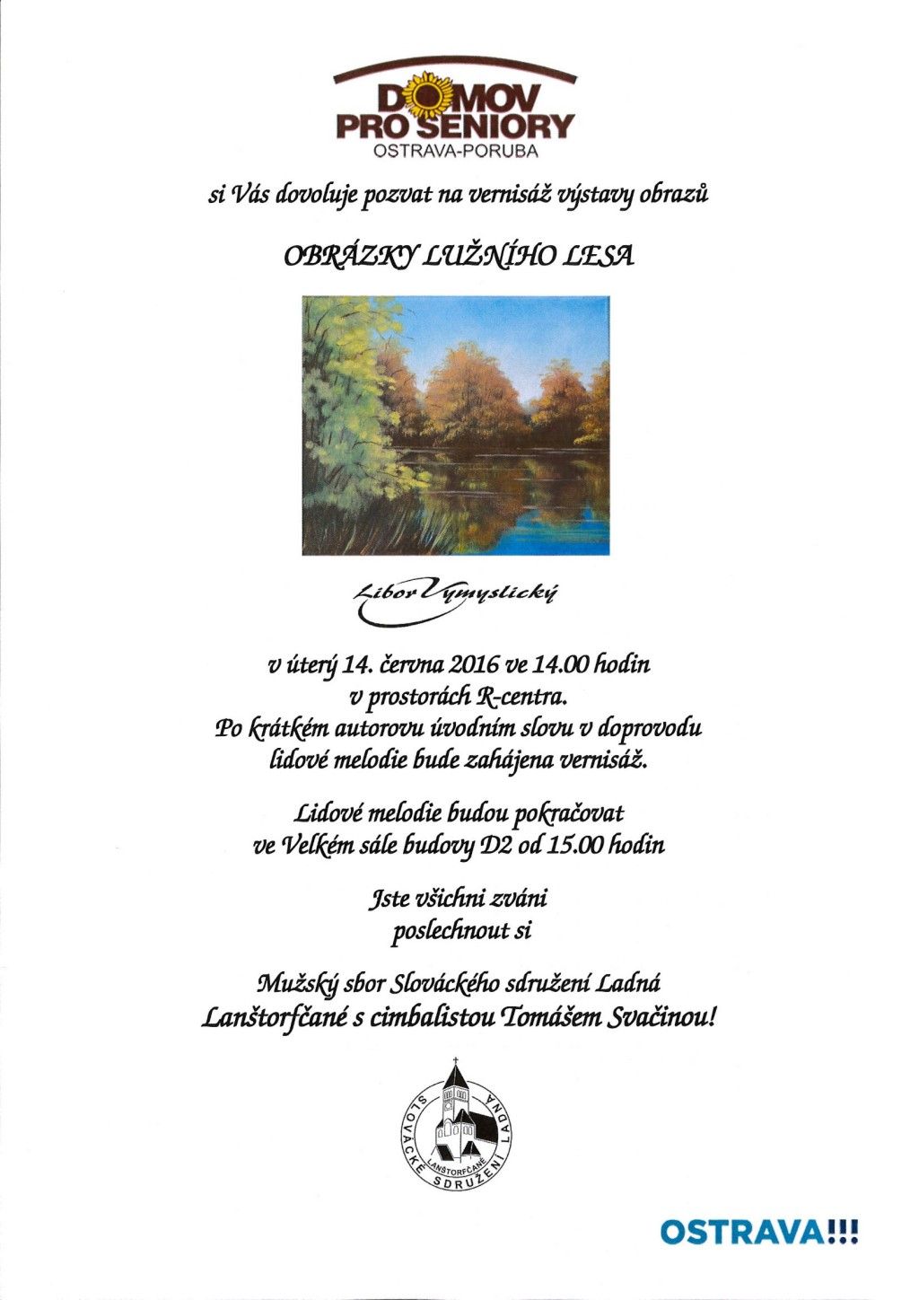 V červnu jsme se vypravili s Lanštorfčany do Ostravy. Uskutečnila se vernisáž a následně odpolední posezení při cimbálu v Domově Slunečnice Ostrava, p. o. Pro klienty, zaměstnance a hosty byl připraven slavnostní program. Výstavu zahájil úvodním slovem pan ředitel Ing. Radek Baran. U příležitosti 50. a 40. výročí založení organizace jsem předal panu řediteli dar v podobě obrazu – jak jinak než s motivem slunečnic. Po vernisáži následoval koncert Lanštorfčanů, díky nimž si obyvatelé domova mohli zazpívat moravské lidové písničky a opět chlapi dokázali, že umí.