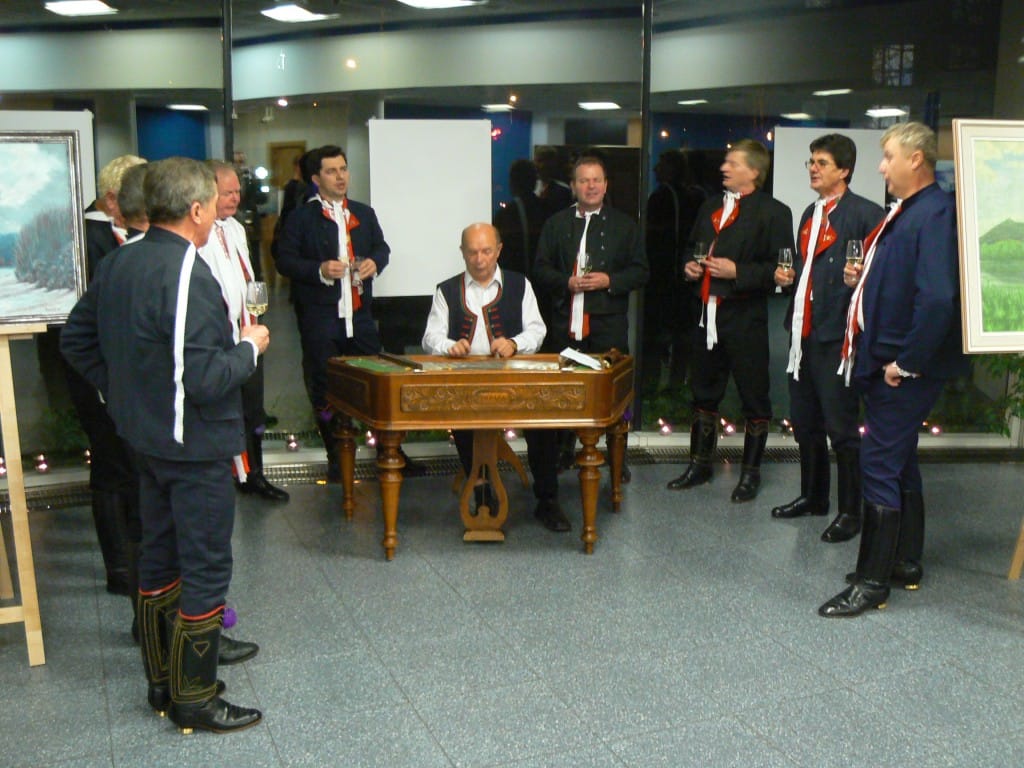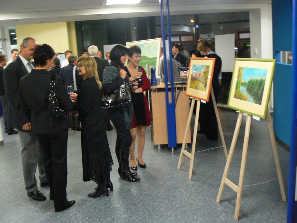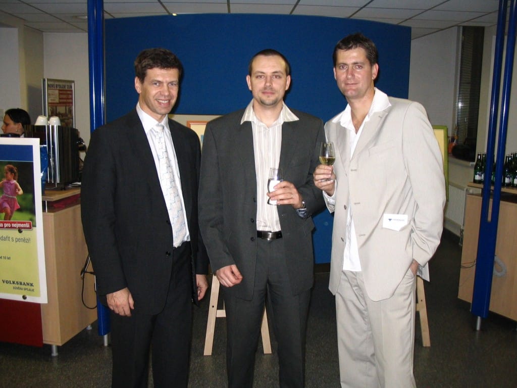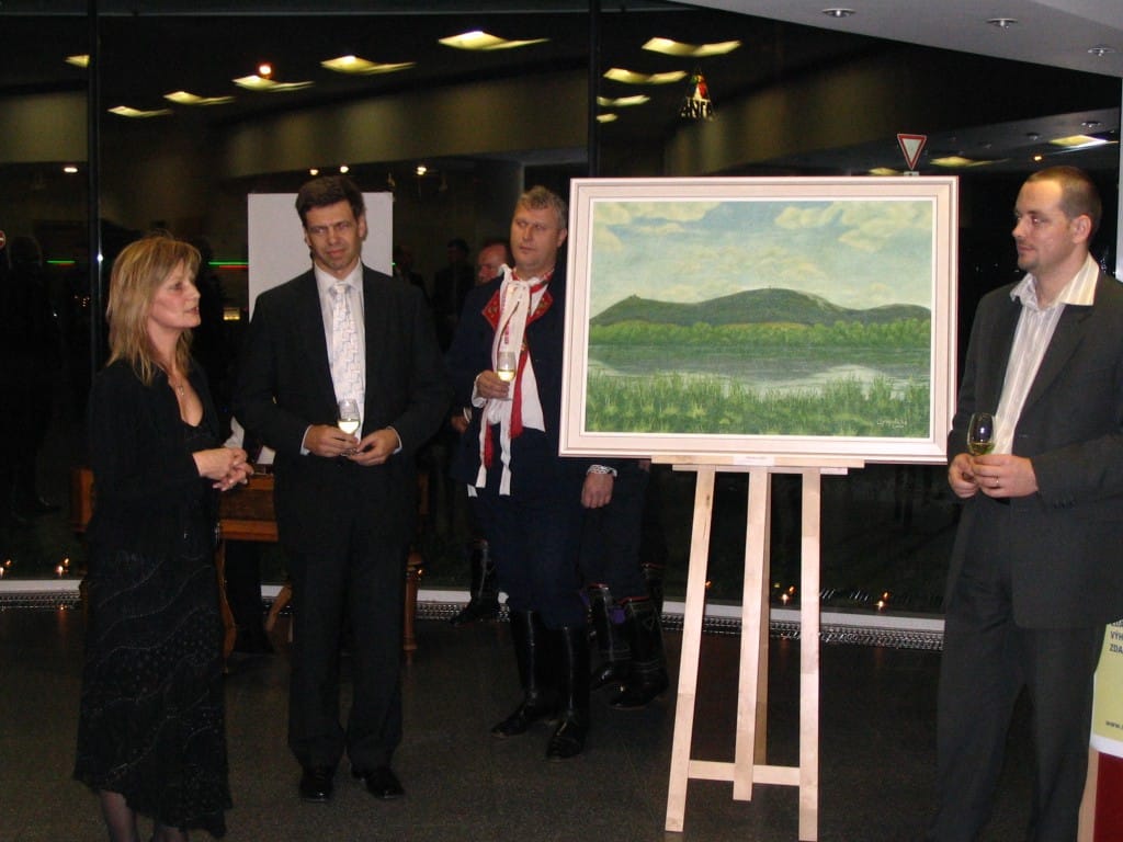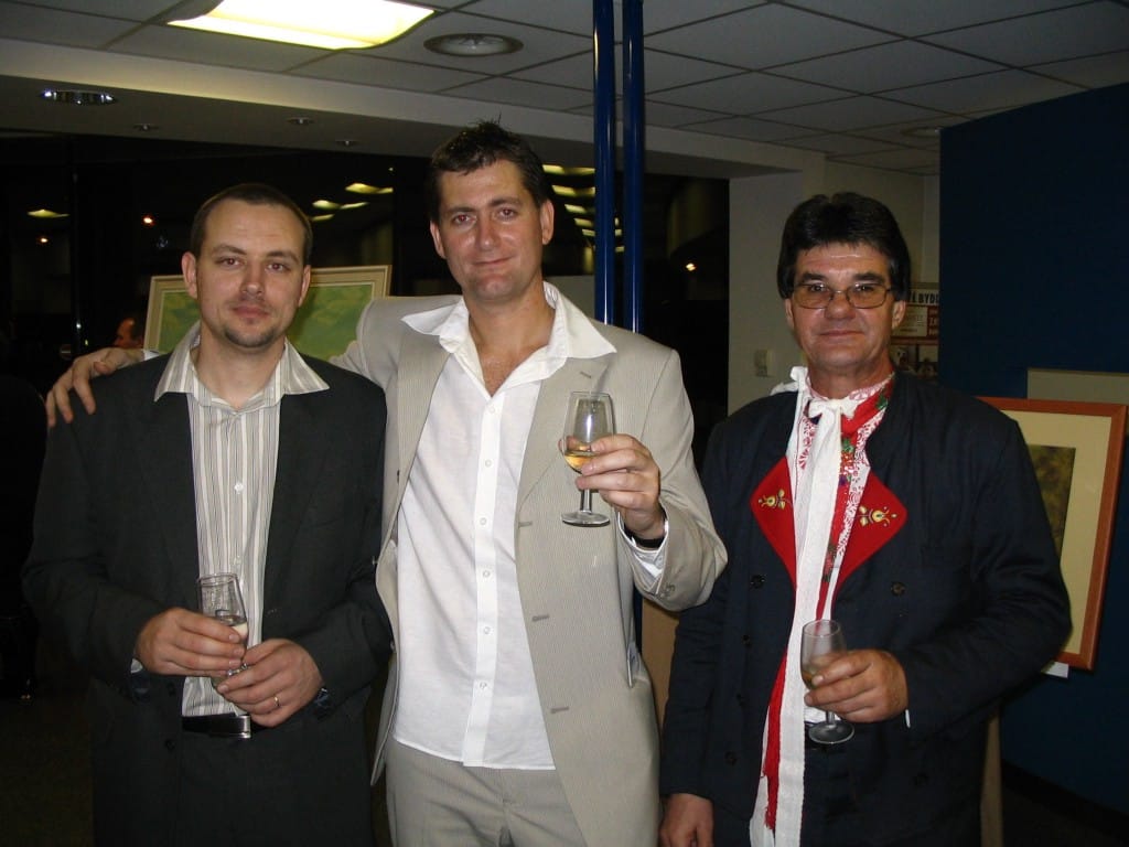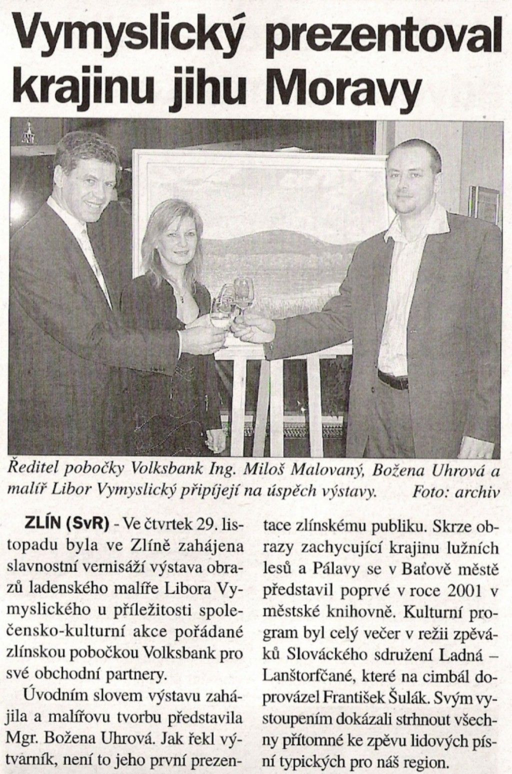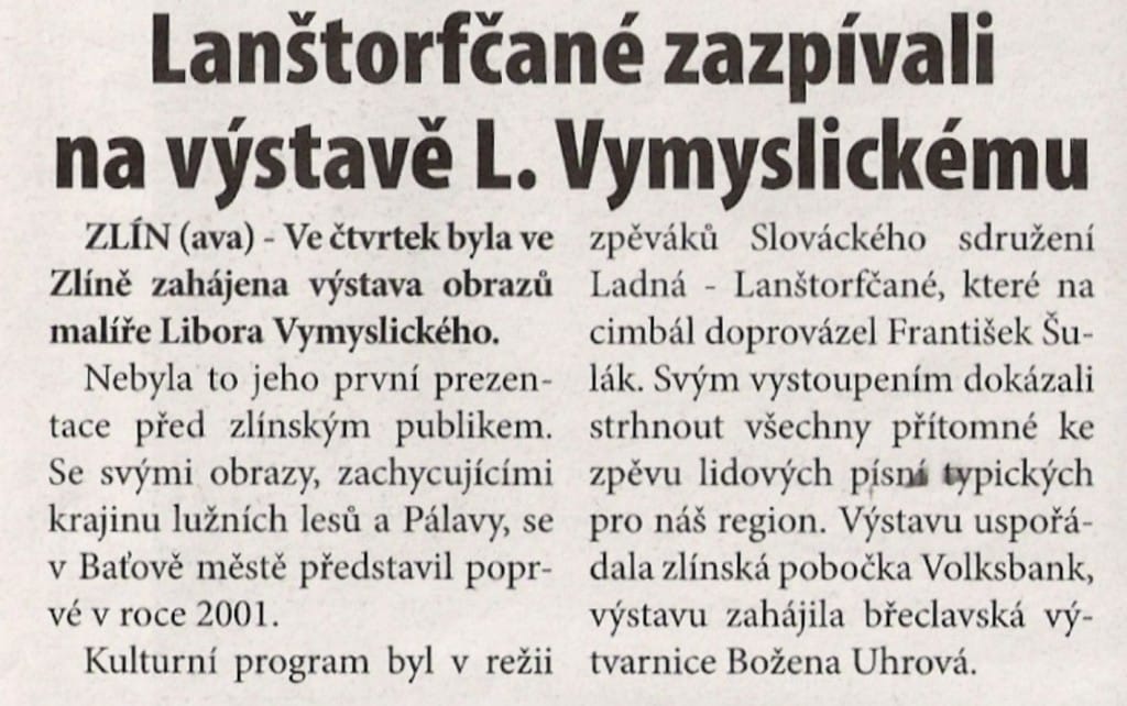 To se tak jednou v jedné bance rozhodovalo, jakou kulturní akci připravit se závěrem roku pro VIP klienty. Jakou náhodou v oné bance pracuje můj bratr a mezi řádky zmíní, že by se možná hodila výstava a lidová písnička. No a vedení banky se jalo nápad zrealizovat. Tak se stalo, že jsme uspořádali spolu s Lanštorfčany vernisáž a večer s cimbálem. Vypravili jsme se směr Zlín ještě s paní Boženkou Uhrovou, která výstavu zahájila spolu s panem ředitelem banky Ing.Malovaným. Majstr cimbalista pan Šulák doprovázel mužáky po celý večer na svůj nástroj a během chvíle se k nim zpěvem lidových písní přidali všichni zúčastnění při ochutnávce vína.